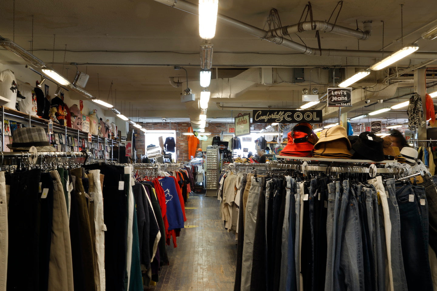 Daily drops of curated Nike, Adidas, and Carhartt vintage streetwear. Thrift Levi's jeans, leather coats, light jackets, workwear and a big selection of vintage and printed T's. Find that elusive band T, endless sports and varsity Tees, funny, outrageous and just plain cool T-shirts. Sift through racks of crewneck sweaters and hoodies. Check out the vintage & new rings and earrings, hats and accessories.